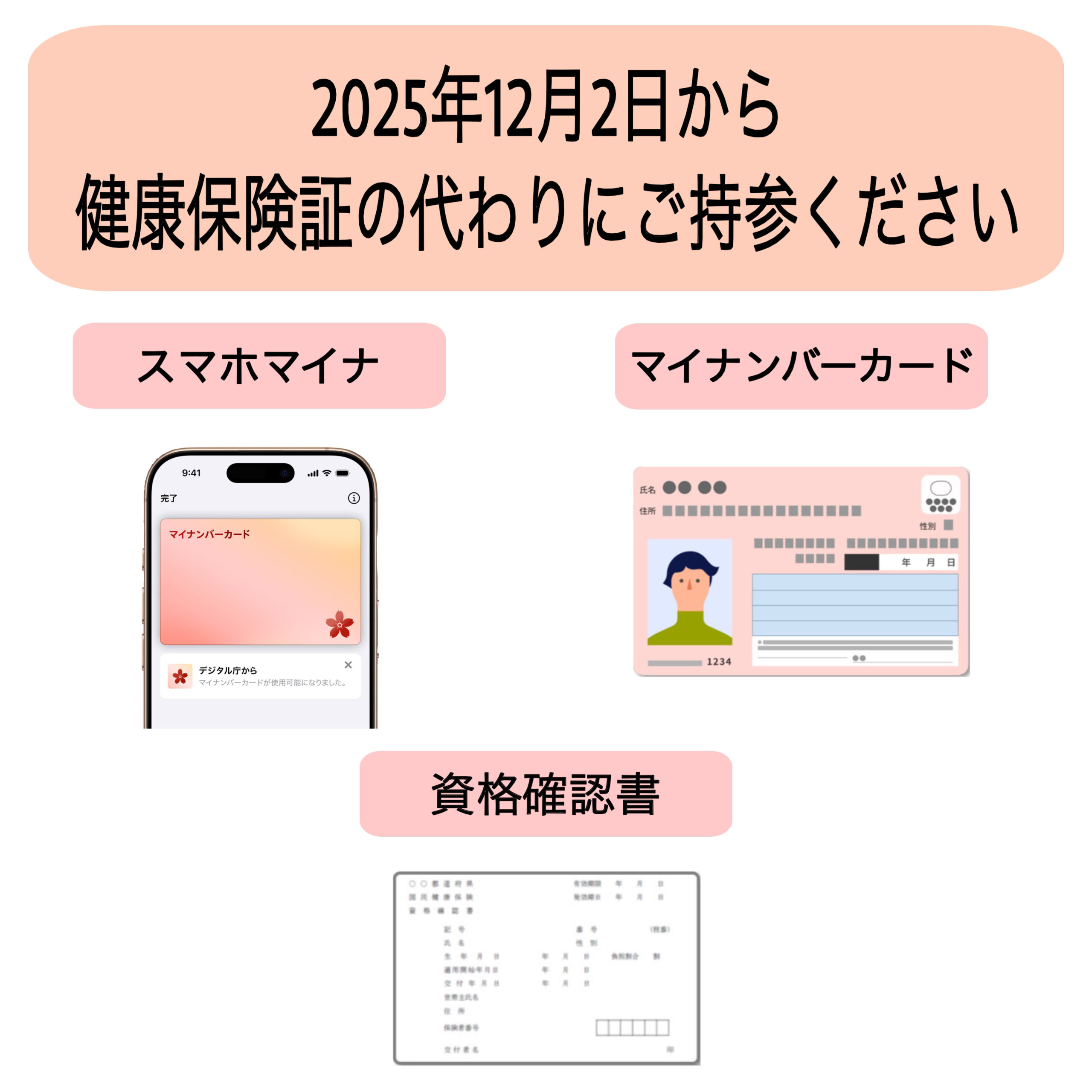 2024年12月に新規健康保険証発行が終了し、1年間の移行期間を経て2025年12月2日から「健康保険証」は利用不可となります。